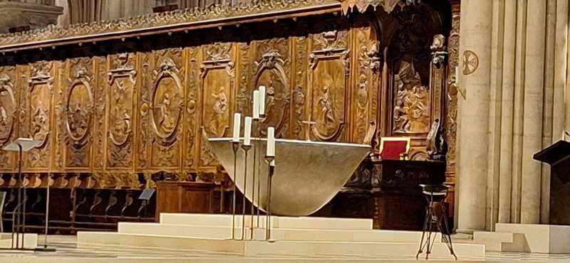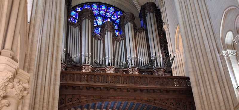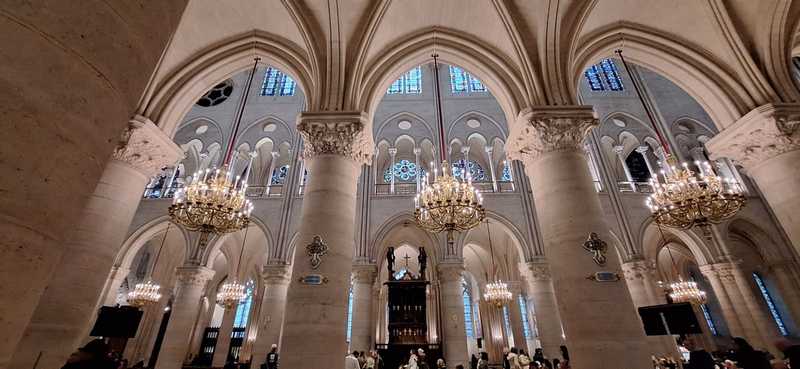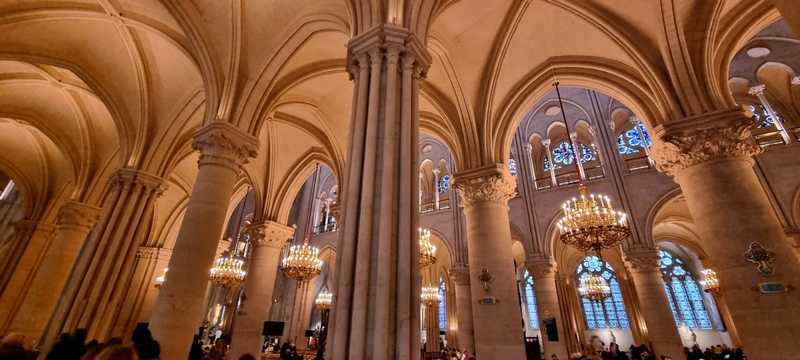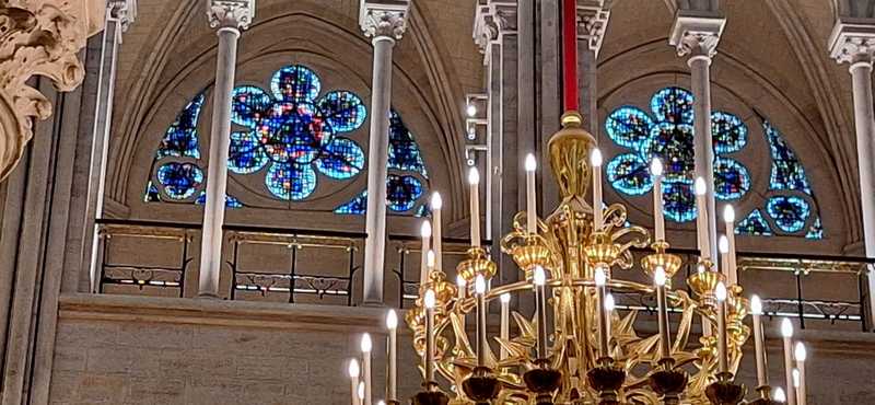 En arrivant sur le parvis le choc ! Elle est bien là, debout… La file d’attente est impressionnante, mais nous entrons assez rapidement tout en écoutant les explications de notre guide. La construction de la Cathédrale lancée en 1163 s’étale sur près de deux siècles. Entre 1845 et 1867 Notre-Dame bénéficie d’une importante rénovation sous la direction de l’architecte Eugène Viollet-le-Duc, la flèche culminant à 95 m de hauteur est une prouesse à l’époque, elle sera ravagée par l’incendie de 2019, nous nous souvenons tous de sa chute…A son rythme chacun fera la visite intérieure.